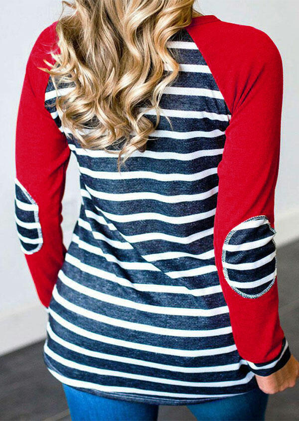 Color and style add a new dimension to the classic baseball tee. Striped bodice with coordinating wristbands and elbow patches. Contrasts with red sleeves and crewneck outline. A great everyday top to add to your casual wear collection.